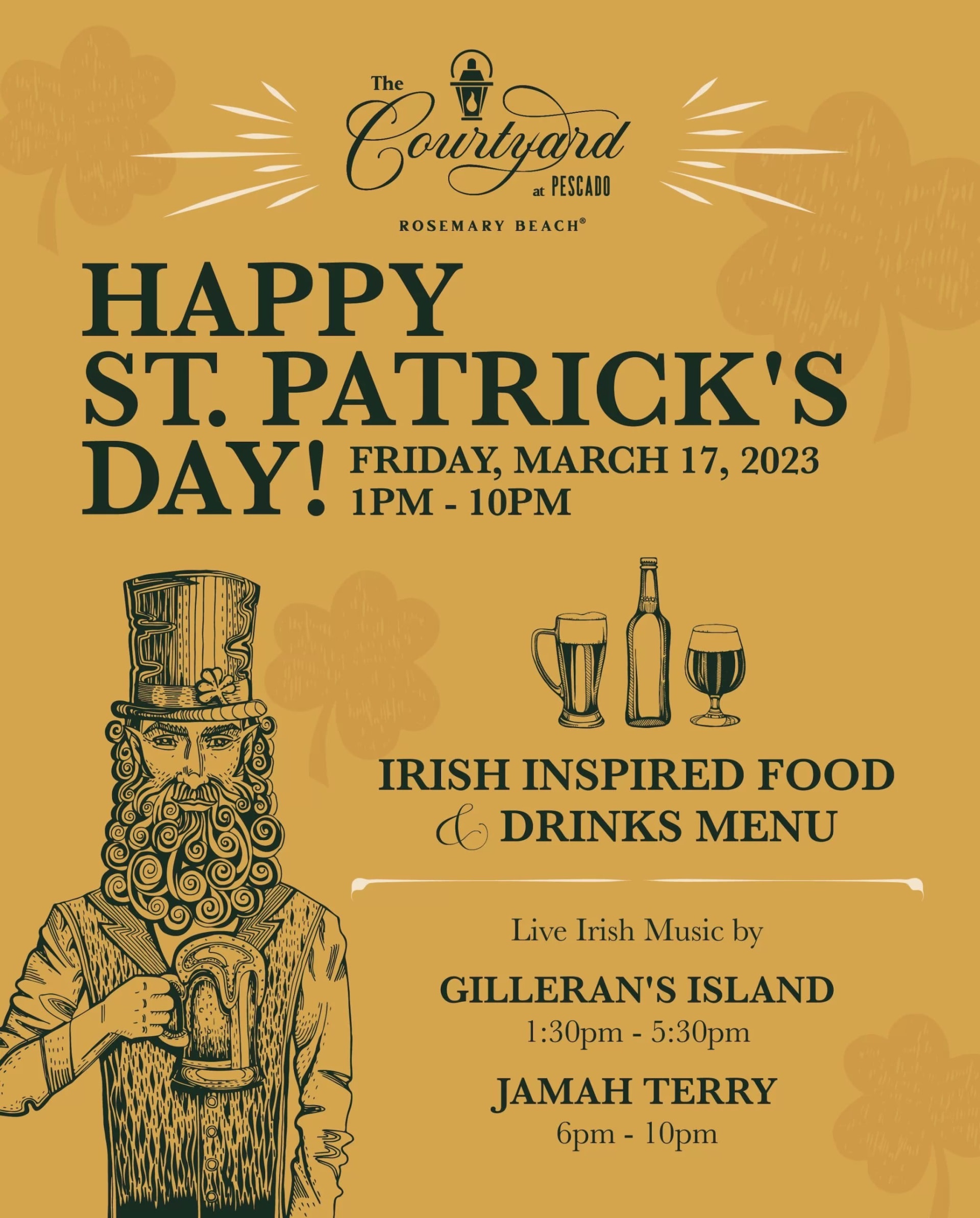 The Courtyard at Pescado in Rosemary Beach® is hosting a boozy soiree this St. Patrick’s Day, March 17, from 1:00 – 10:00 PM. Patrons can order Irish inspired food and drinks right off the menu whilst unwinding among the debaucherous. Enjoy live music by Gilleran’s Island from 1:30pm- 5:30pm and Jamah Terry from 6pm-10pm. You’re sure to have a grand time and be fluthered and full on this blessed occasion.
